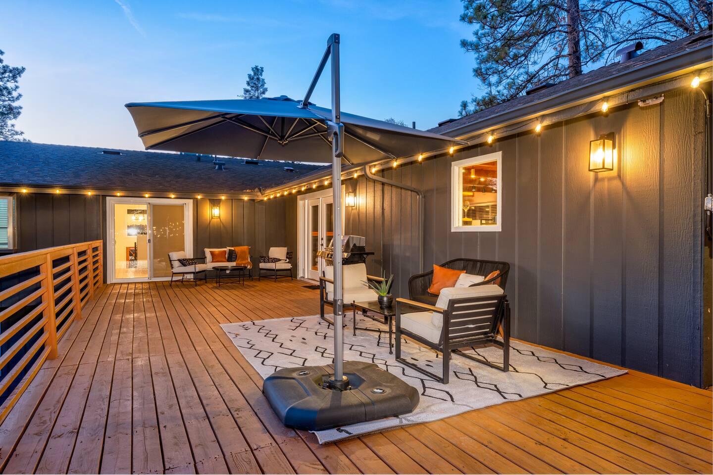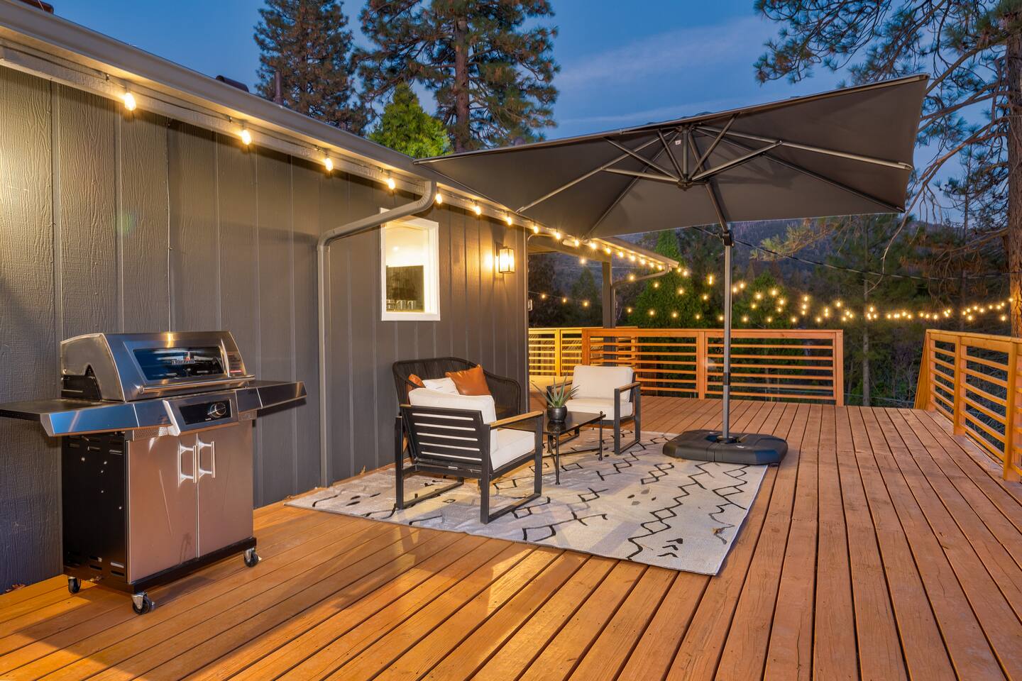 -Oversized deck with 3 seating areas, including propane grill and large umbrella