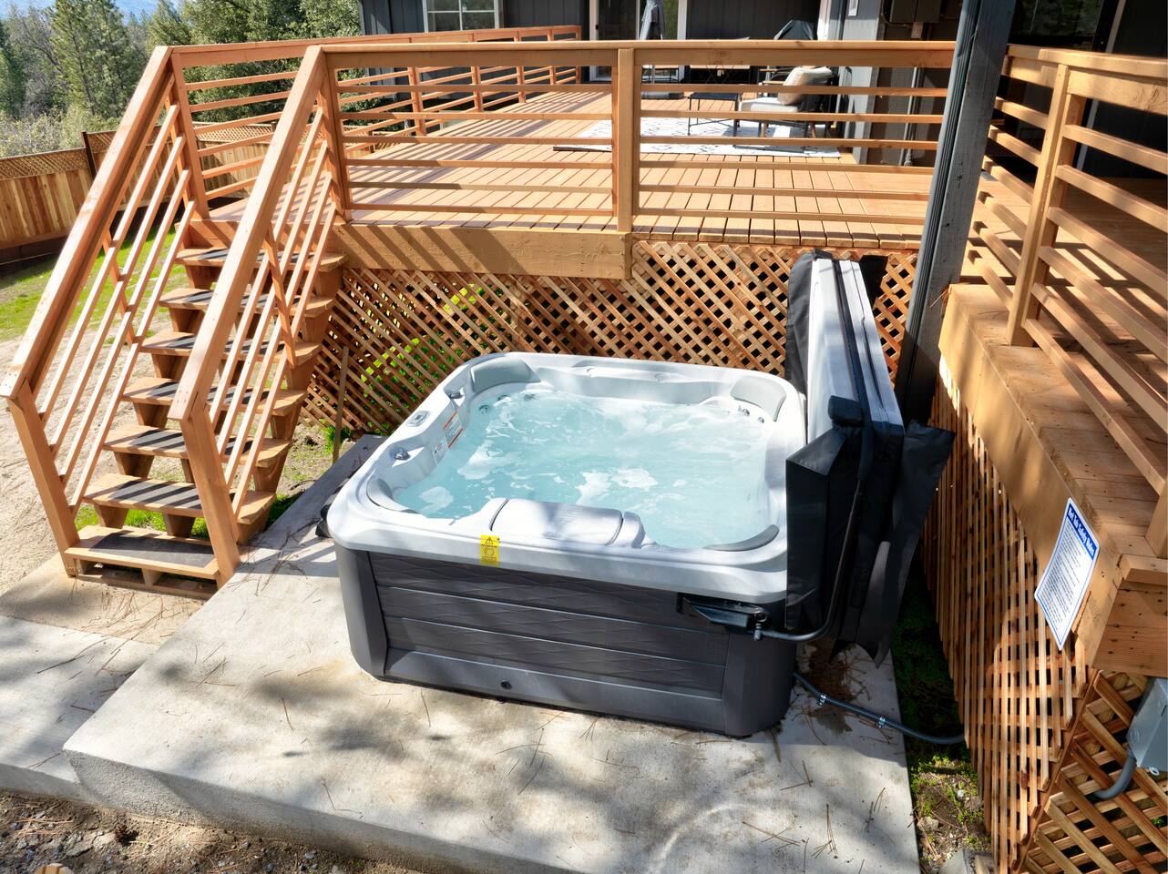 -Fenced backyard with hot tub, propane fire pit, corn hole set and Adirondack lounge seating
